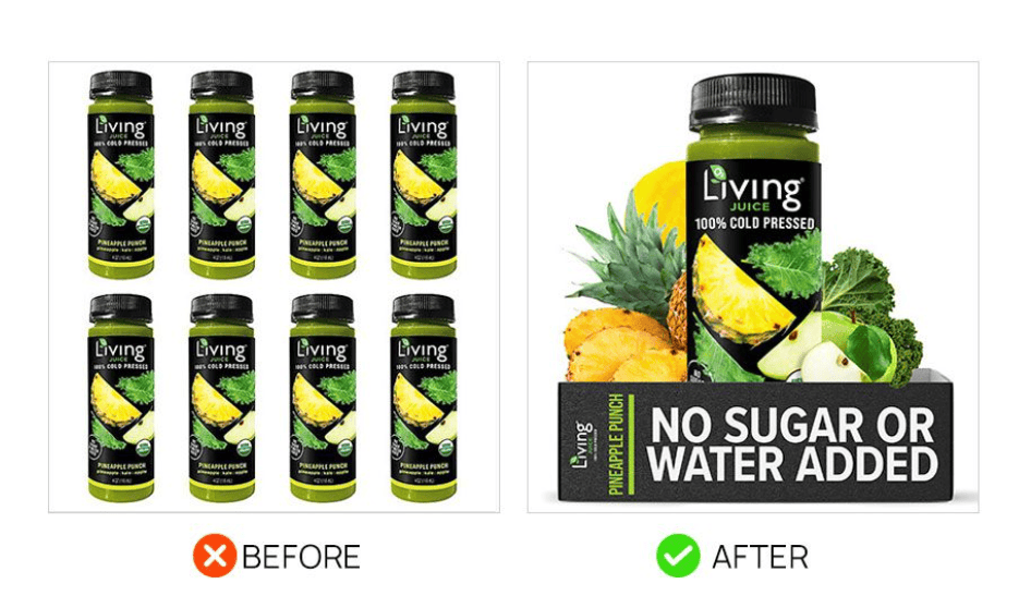 The first image of the Living Juice did show how many someone will receive upon purchase but it’s less important than showing the fruit and veggies off. Given that consumers are keen on sugar-free options, we've prominently featured the no-added-sugar benefit on the packaging, ensuring it stands out in search results as a key selling point.