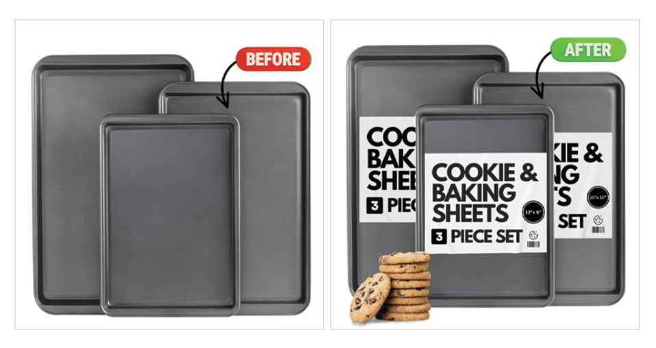 You can smell the difference. Simply adding cookies and a sticker on the pan with a keyword that shows what the product can be used with makes this stand out. Adding the 3 piece set also helps consumers understand what they are getting quickly.